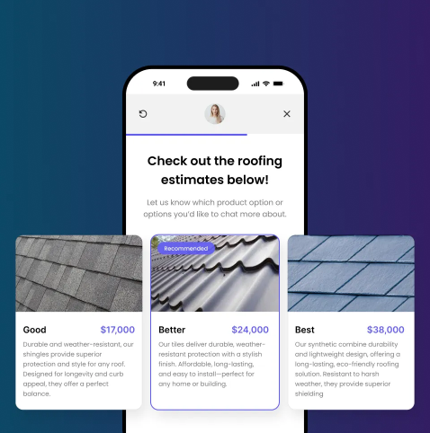 Retail roofing: Deliver instant roof quotes — cash or financed—through a guided experience that captures property details and project scope. Homeowners get clear pricing fast, helping move deals forward with less friction.