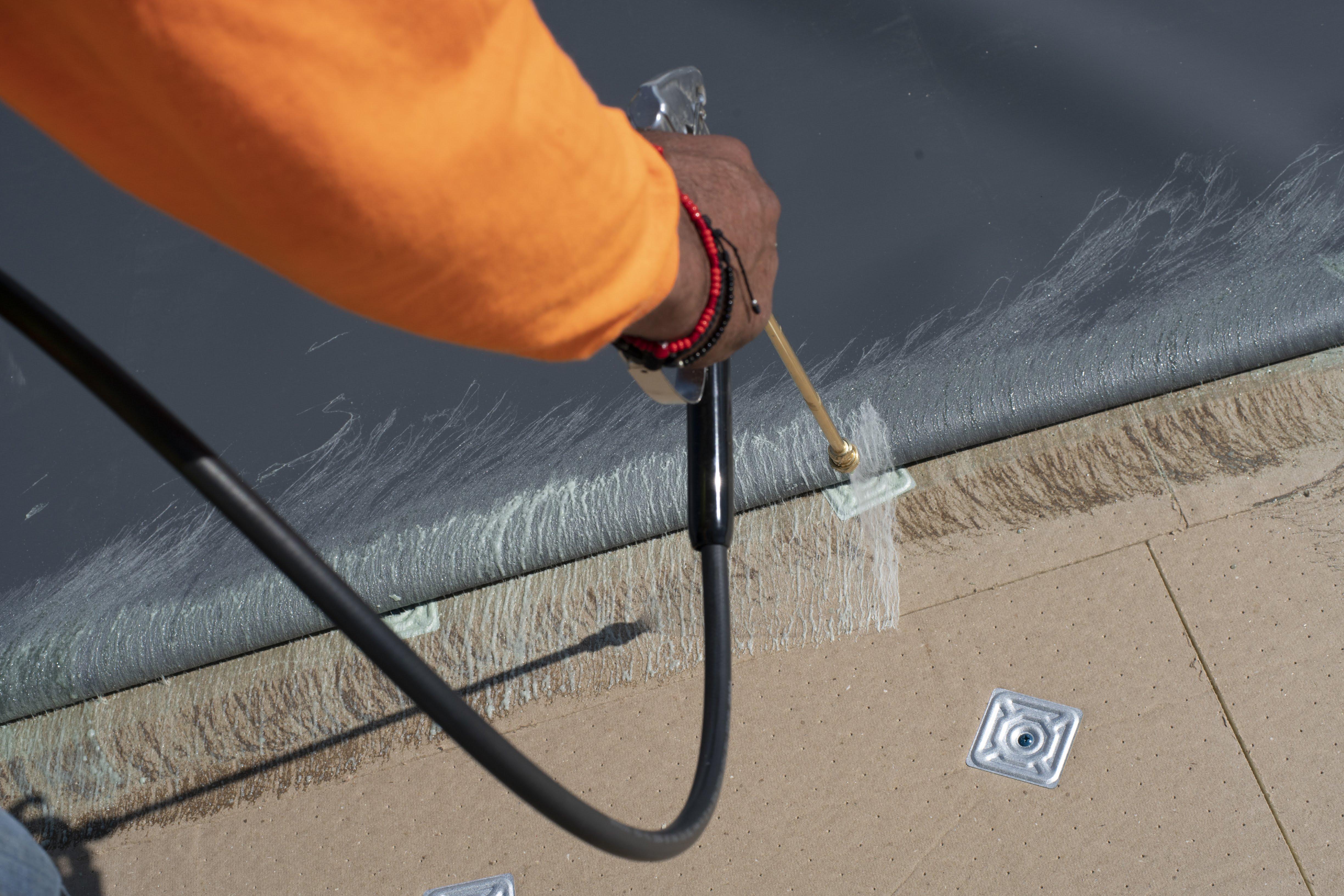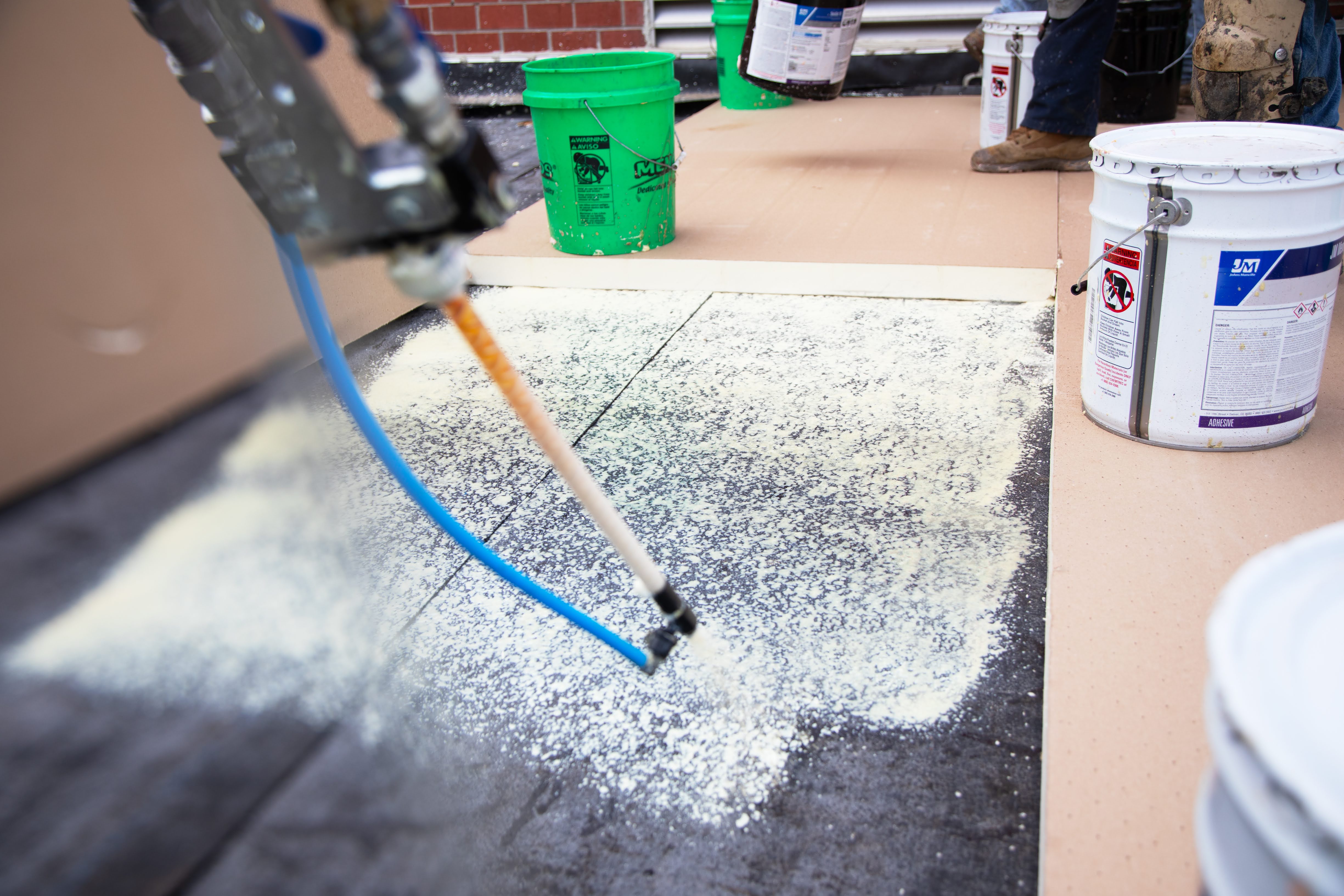 Johns Manville is excited to announce an all-new sprayable adhesive for JM PVC and JM PVC SD Plus. This new adhesive is designed to work in all seasons with a wide temperature window and quick flash-off times which can result in quicker installs even in cold weather. This product can adhere smooth backed membrane to the field and walls.