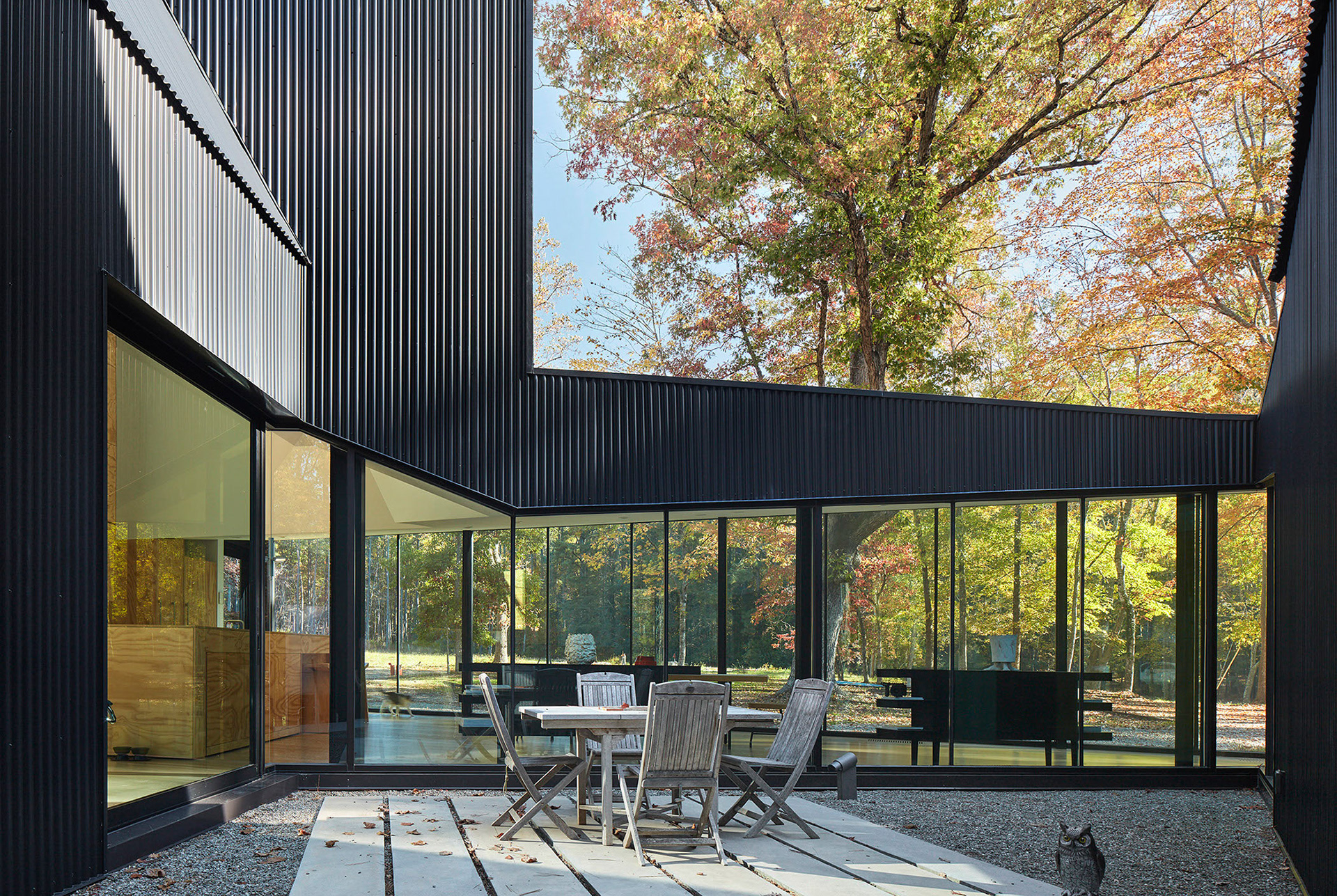 Meeting the challenge and contributing to the structure’s façade is ATAS’ Corrugated Panel. Featured on both the walls and roof of the structure is ATAS’ Corrugated Panel in Black, 24-gauge steel, which adds to its sleek design. Steel panels help the structure meet its sustainable goals by being made of recyclable materials and are entirely recyclable at the end of their 40+ year lifespan, with proper maintenance, which can be more reliable and durable than alternative materials. The steel panels provide durability and design flexibility, contributing to the home’s sharp geometry, with the roof panels sloped at a high pitch to integrate the structure into the surrounding trees.